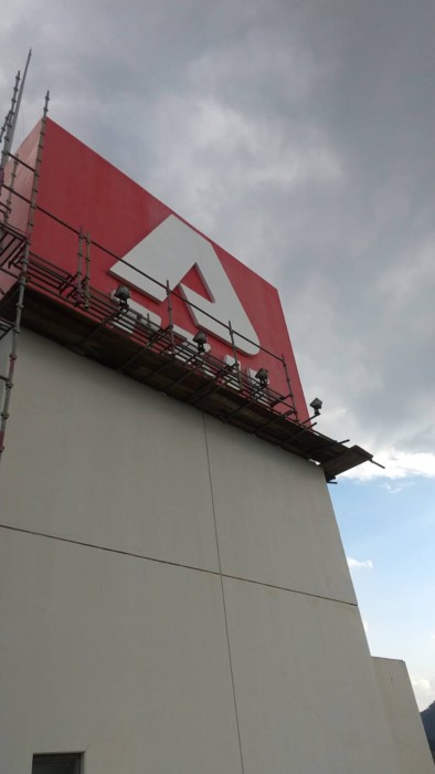 看板改修の張り出し足場です